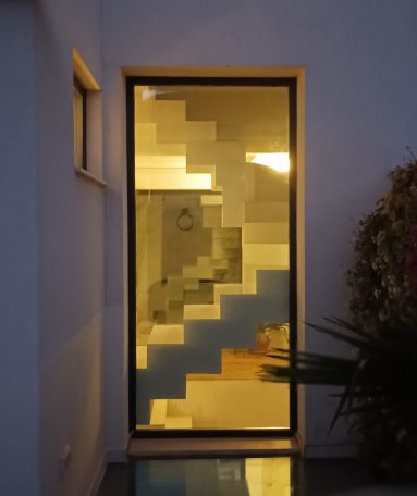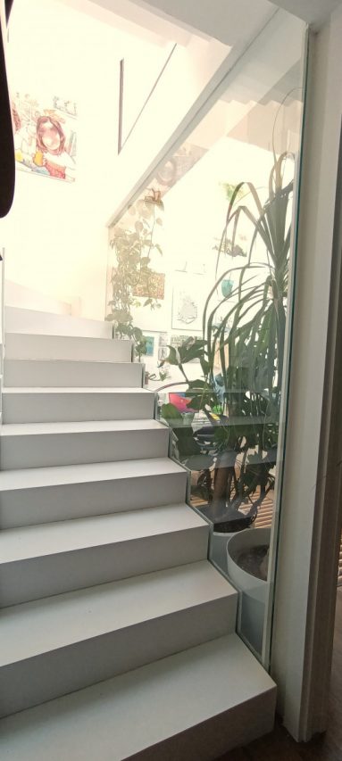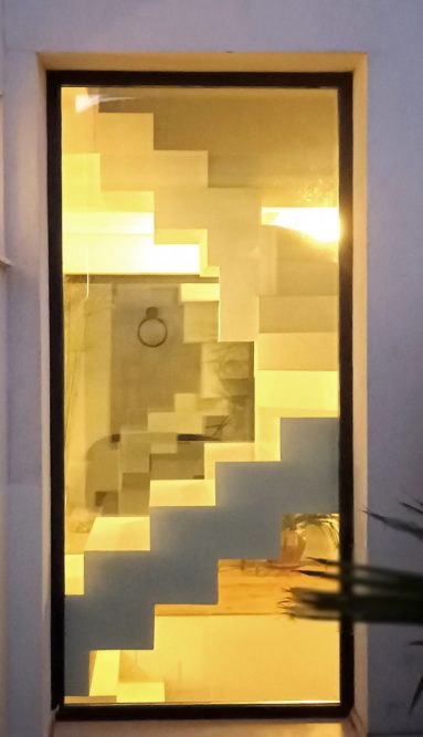En la planta sótano un lucernario de vidrio pisable de grandes dimensiones consigue introducir el espacio exterior, el sol y la vegetación en una zona a priori poco habitable, consiguiendo calefactarla y relacionar la vivienda visualmente mediante sus perspectivas verticales.